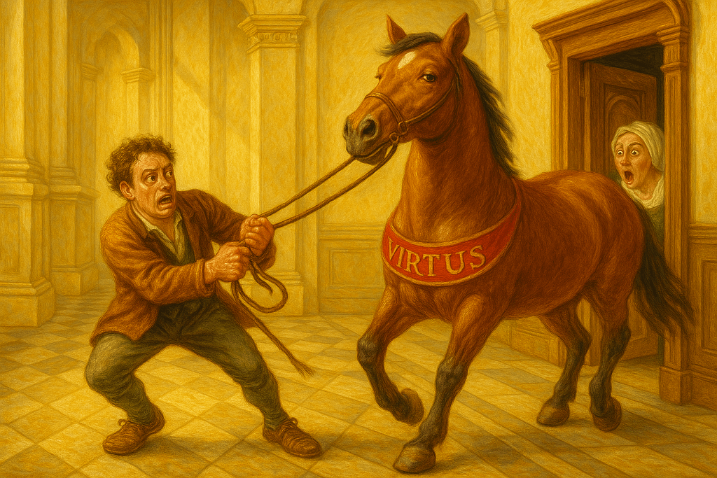 – Olá – disse ela, com um sorriso de soslaio – Meu nome é Alice. E o nome dele é Virtude. Ele escapou da gravação de uma novela de época que está sendo feita aqui perto.