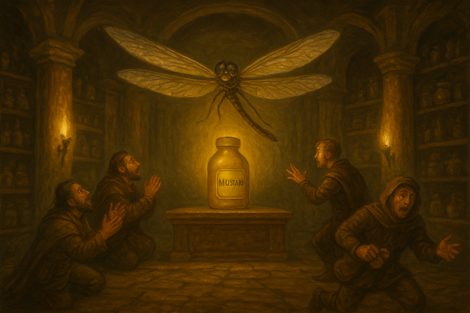 Foi então que chegaram às ruínas de um templo secular, onde descobriram uma estranha sala de repatriação de almas. Não sabiam se deviam rezar ou rir. O templo estava coberto de estantes cheias de frascos com condimentos misteriosos, guardados por uma enorme libélula que parecia hipnotizar quem a olhava.