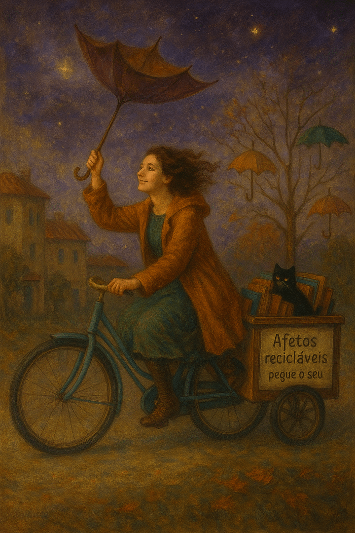 Pouco depois, lá vinha ela, em sua bicicleta azul clara, capa de chuva laranja, uma blusa verde e um guarda-chuva invertido girando no alto como antena de outro mundo. Atrás, uma carroça barulhenta carregava livros usados e uma caixa onde se lia: “Afetos recicláveis – pegue o seu”.