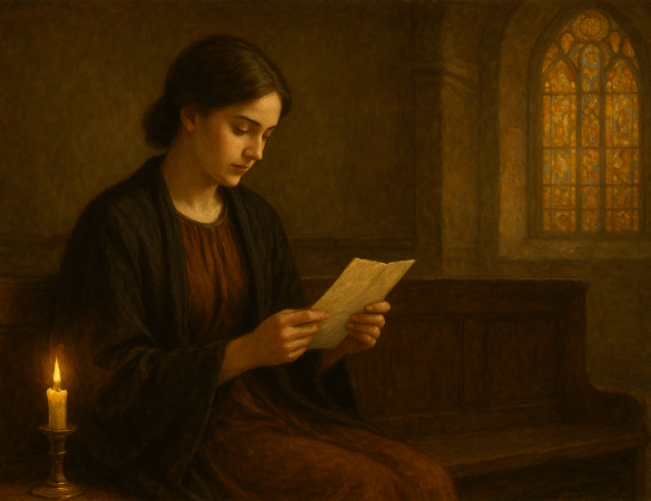 Ela se sentou no banco da capela vazia. As janelas tingiam o chão com vitrais dourados e rubros, como se o céu estivesse contando segredos em cores. Na mão, segurava uma carta antiga, dobrada com cuidado, amarelada nas bordas, escrita com a caligrafia trêmula de quem escreve mais com o peito do que com a mão.