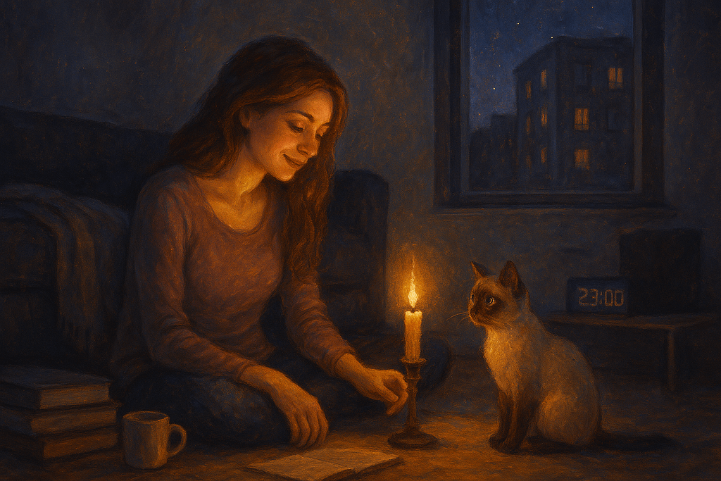 Naquela noite, a energia da casa parecia diferente. O vento lá fora fazia a luz piscar, e Tobias… estava sentado na mesa, encarando uma vela acesa.