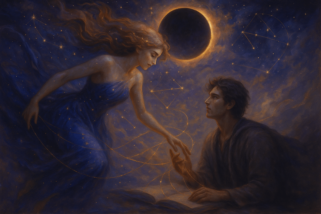 Liora caiu do céu na noite do eclipse. Literalmente. Era uma guardiã das constelações, uma criatura feita de poeira estelar, além de ser encarregada de proteger os fios que conectam os amores certos. Só os certos. Os permitidos. Só que naquela noite, tropeçou em um fio enredado, como uma promessa antiga mal costurada, e foi puxada com força para o plano inferior: a Terra dos Errantes, onde vivem as histórias que não deveriam acontecer.