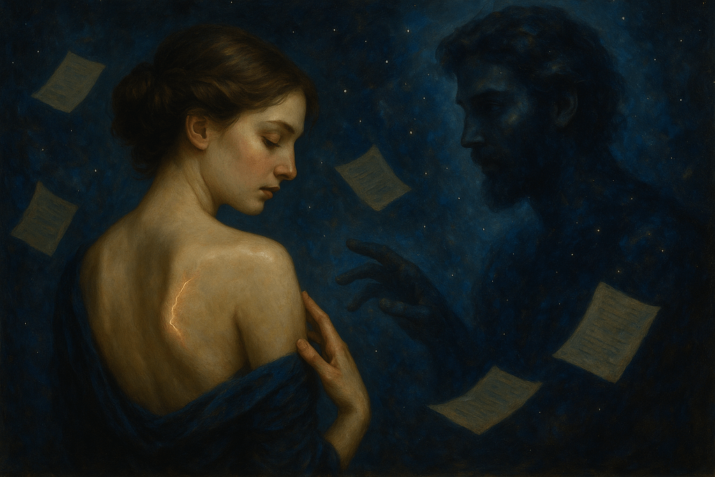 Na mitologia do Cósmica Palavra, a Deusa da Terra guarda em suas costas uma cicatriz de luz. Nunca disse ao Deus do Universo como ela surgiu. Mas ele, ao tocar aquela marca, entendeu tudo.