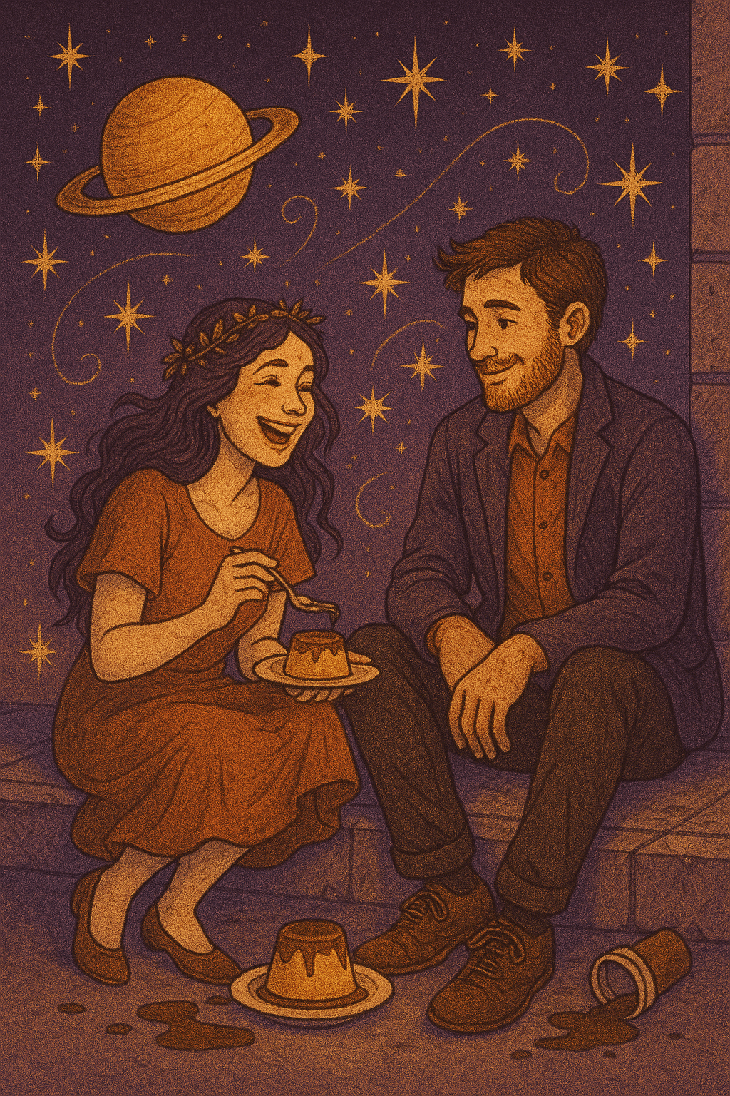 Sentados na calçada, dividindo o pudim questionável, entendi: encontros icônicos não vêm em embalagens perfeitas. Eles vêm suados, descabelados, cheirando a café ruim e com doces torturados nas mãos.