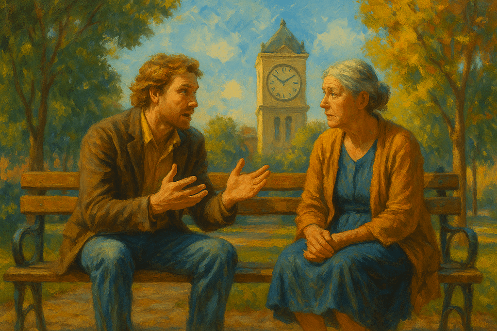 Nasceu da vontade de transformar o cotidiano em palco e o diálogo em espelho. É uma conversa entre duas pessoas (ou talvez duas versões de nós mesmos) sobre o tempo que corre, escapa, some e, às vezes, para. Não por má vontade, mas porque quer ser notado. Neste roteiro, o humor se mistura com a filosofia leve de quem tenta entender o relógio da vida sem enlouquecer com seus ponteiros.