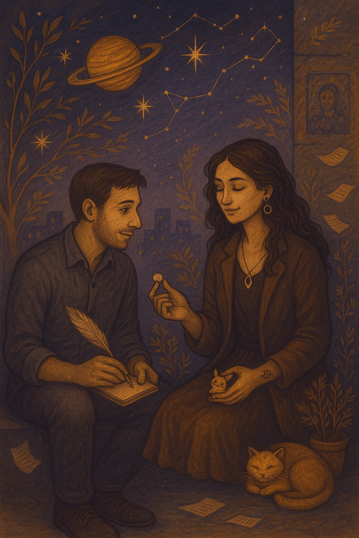Ali, mesmo com os ruídos da cidade e o vai e vem das distrações, nasceu um silêncio confortável. Do tipo que só acontece entre almas que, em outra dimensão, talvez já tenham se conhecido. Ele tentou encontrar lógica naquilo. Procurou alguma pista, algum sinal. Mas só encontrou jesus pintado num azulejo antigo da parede ao lado e um gato dormindo entre vasos de erva-doce. Era tudo tão comum… e ao mesmo tempo tão vasto.
